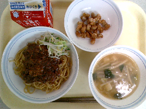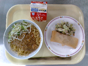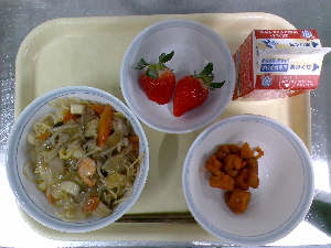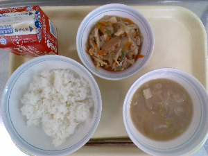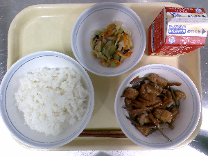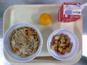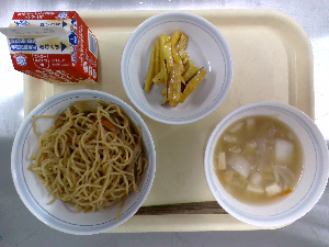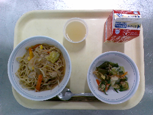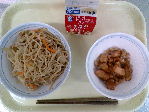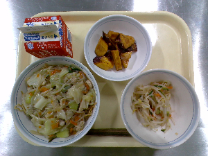 【今日の給食】牛乳 豚肉と野菜の炒めそば ビーンズポテト