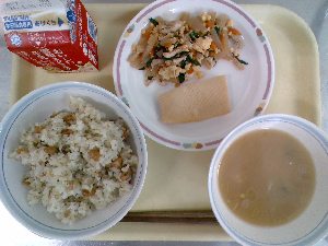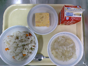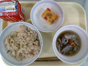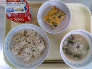 【今日の給食】牛乳 たけのこごはん 具だくさんたまご焼き みそ汁