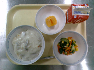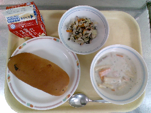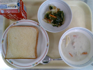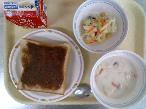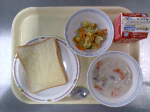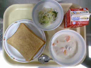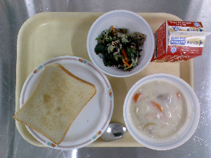 【今日の給食】牛乳 シュガートースト 海藻サラダ 春野菜のクリームシチュー