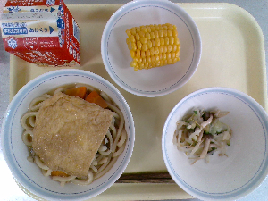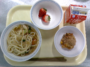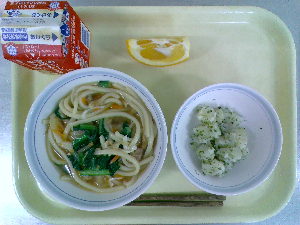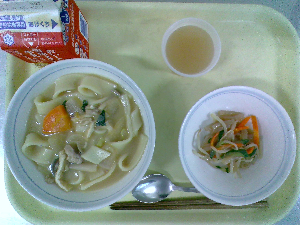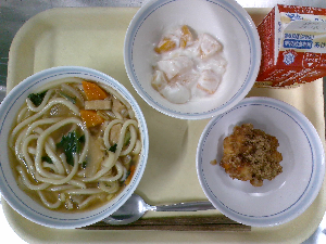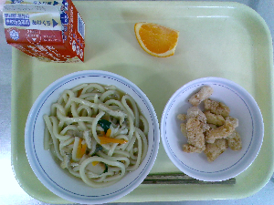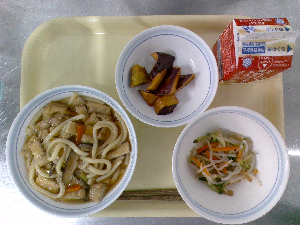 献立:冬至うどん 牛乳 魚とれんこんの風味揚げ