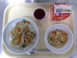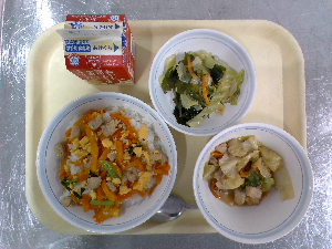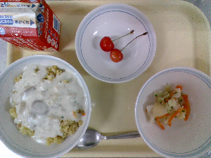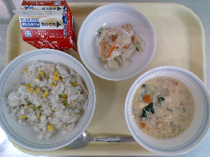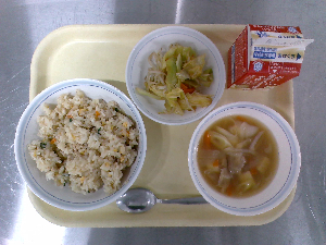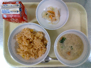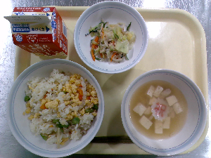 【今日の給食】牛乳 チキンライス サウピカンサラダ 洋風かきたまスープ