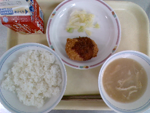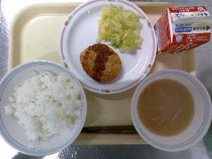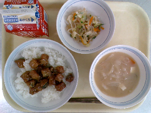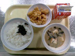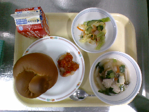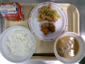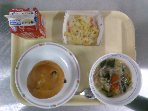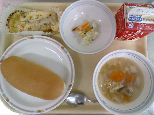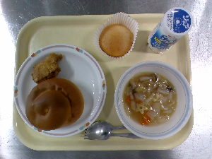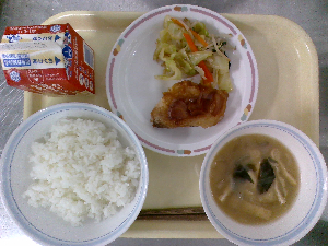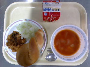 献立:ミルクパン 飲むヨーグルト ロックチキン もみの木サラダ ジュリエンヌスープ