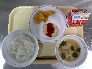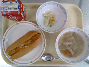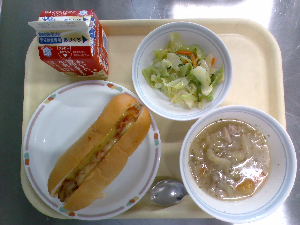 献立:中華ドッグ 牛乳 ツナコーンサラダ ワンタンたまごスープ