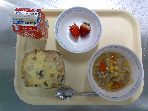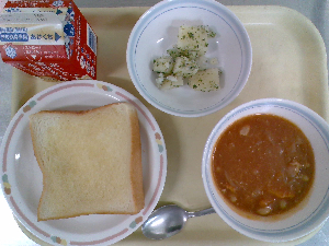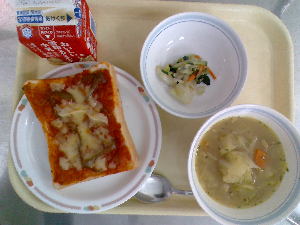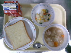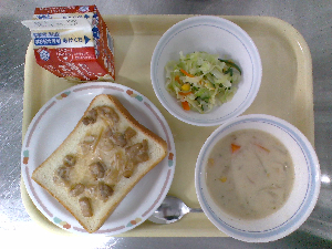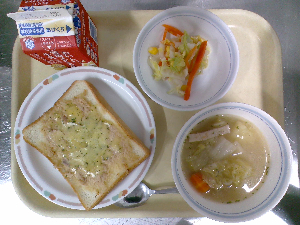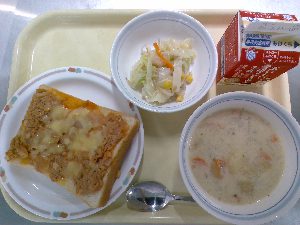 献立:ツナチーズトースト 牛乳 ボルシチ コーンサラダ