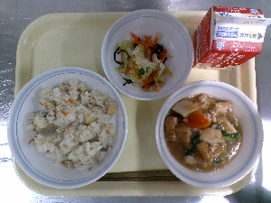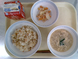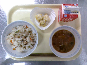 献立:中華おこわ 牛乳 豆腐ボールのあんかけ わかめスープ