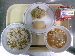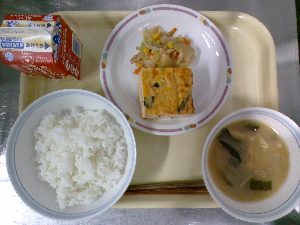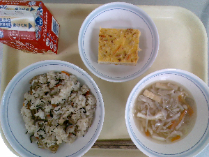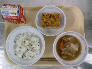 献立:ごはん 韓国風海苔のふりかけ 牛乳 柳川風たまご焼き 石狩汁