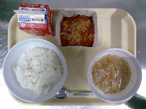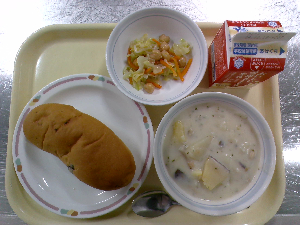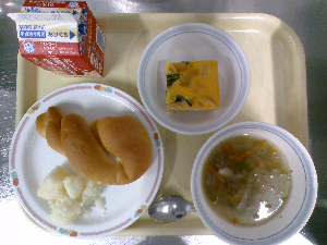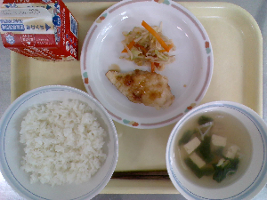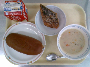献立:ミルクパン 牛乳 魚のバーベキューソース チーズポテト トマトスープ
