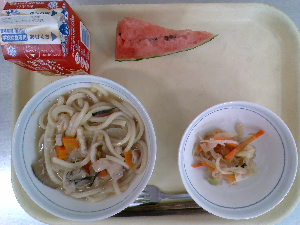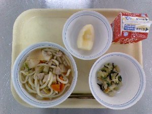 【今日の給食】牛乳 肉野菜うどん 青のりポテト 果物