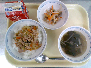 【今日の給食】牛乳 かつおのあずま煮丼 野菜の酢じょうゆ和え 呉汁