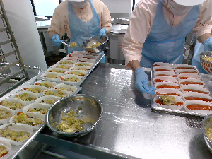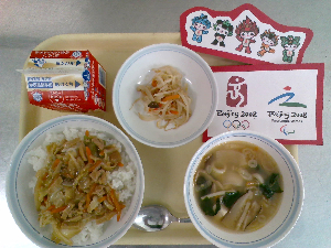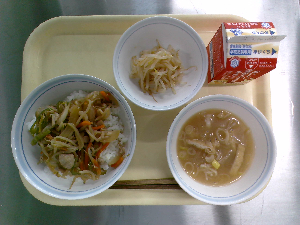 産地:〇米・・・千葉県 〇麦・・・福井、石川、富山県 〇にんじん、ねぎ・・・千葉県 〇じゃが、鮭、コーン・・・北海道 〇もやし・・・栃木県 〇キャベツ・・・愛知県 〇たまご・・・青森、岩手県 〇豚肉・・・茨城県 〇小松菜・・・東京都 〇ごま・・・中南米 〇わかめ・・・三陸