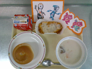 ひとこと:今日は、クリスマス給食です。主菜のロックチキンは、鶏肉にコーンフレークをつけて揚げた料理で、見た目がごつごつした岩のようにみえることから、この名がつきました。2学期最後の給食を楽しみながら味わいました。
