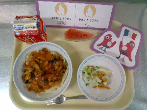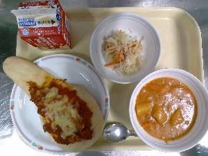 献立:スパゲティカレーミートソース 牛乳 にんじんドレッシングサラダ りんごケーキ