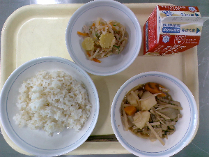 ひとこと:今日は、かみかみ給食です。ちりめんじゃこやごまが入った骨太ふりかけは、カルシウムがたっぷりで、骨や歯を丈夫にしてくれます。かみかみ和えは、さきいか、切り干し大根、にんじんなどを使った、かみごたえのある和え物です。