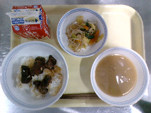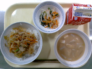 献立:豚肉のしぐれご飯 牛乳 切干大根のたまご焼き みそ汁
