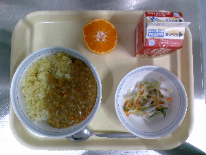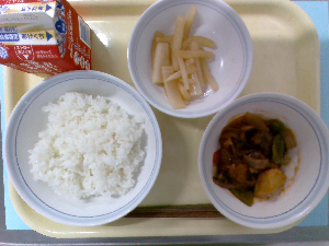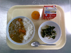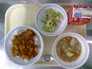 献立:冬野菜のカレーライス 牛乳 海藻サラダ りんご