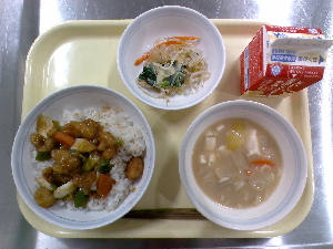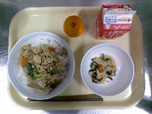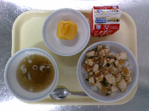 【今日の給食】牛乳 高野豆腐そぼろ丼 豚汁 くだもの