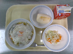 献立:あんかけ焼きそば 牛乳 ビーンズポテト りんご