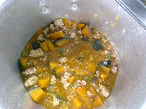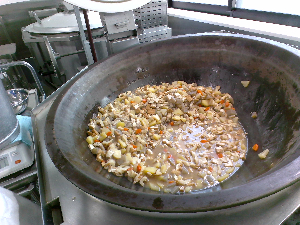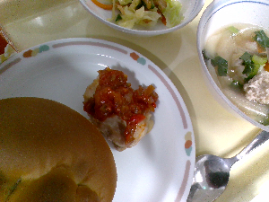 ひとこと:今日の主食は、中華ドッグです。中華まんの具を作り、ミルクパンにはさみ焼きました。鶏肉、大豆、にんじん、玉ねぎ、たけのこ、干ししいたけの具がたっぷりです。