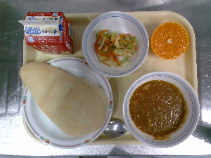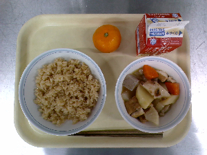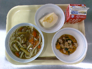 ひとこと:今日の主菜は、冬野菜のカレーです。冬野菜は、寒さに強く、甘みがあるものが多いです。今日のカレーには、ごぼう、れんこん、小松菜を入れました。デザートのりんごは、青森県のサンふじを届けていただきました。