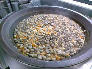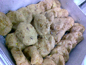 油で揚げた豆と芋を塩こしょうと2種類のスパイスで味付けしています。