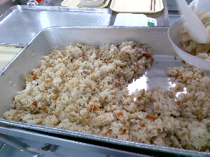 ひとこと:今日の主食・主菜は、ターメリックライスきのこソースです。ソースに入れたえのきとしいたけは、大田区の友好都市、長野県東御市で収穫された新鮮で美味しいきのこです。揚げたワンタンの皮が入ったパリパリサラダは、大人気でした。