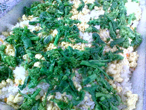 ひとこと:今日の主食は、鮭とたまごのまぜご飯です。鮭を焼き、ていねいにほぐしました。炒りたまごが入った色どりのきれいなご飯です。
