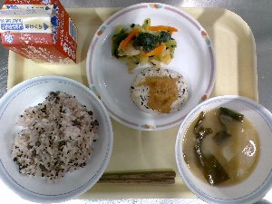 献立:ごはん 骨太ふりかけ 牛乳 野菜とさつま揚げの煮物 かみかみ和え
