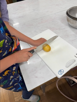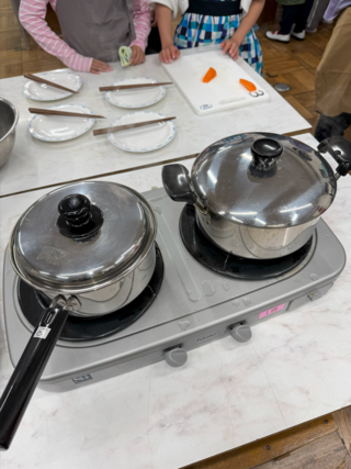 ジャガイモと人参のゆで野菜を作りました。包丁の使い方に気を付けて、チームワークよく取り組みました。