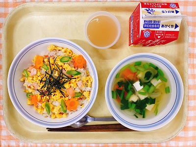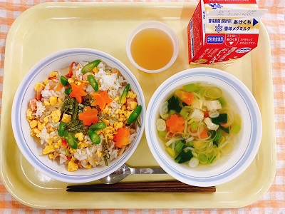 牛乳 鮭のちらし寿司 豆腐のすまし汁 ピーチゼリー