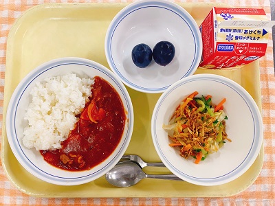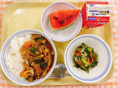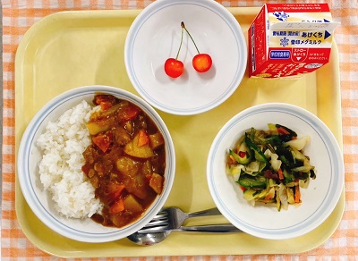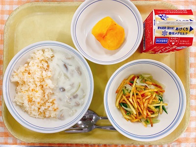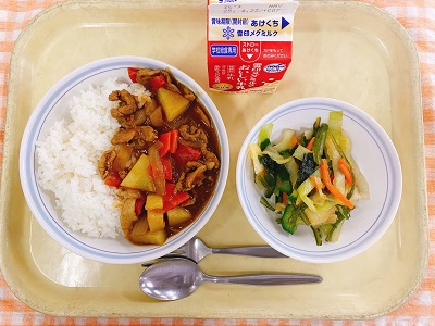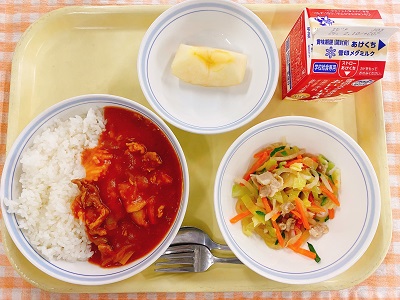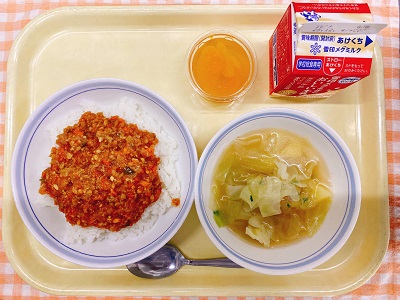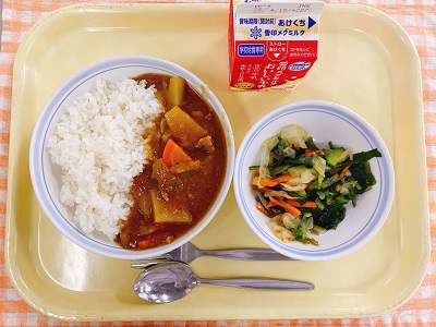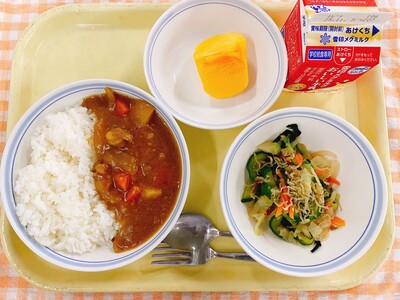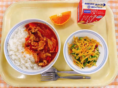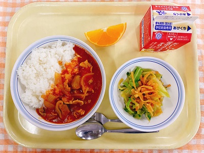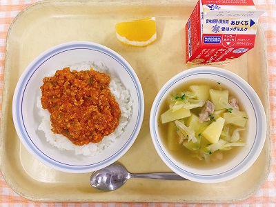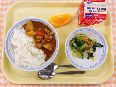 牛乳 ドライカレーライス キャベツとじゃがいものスープ 河内晩柑