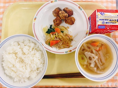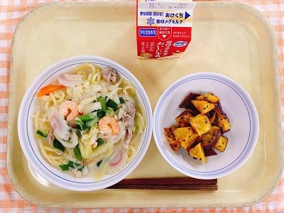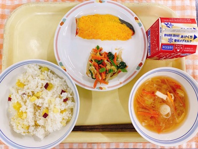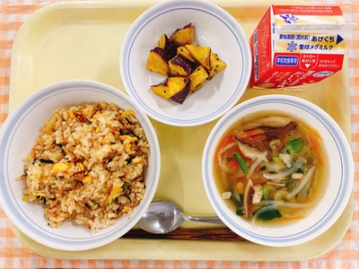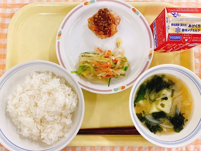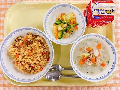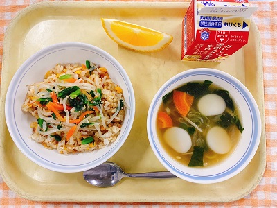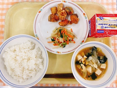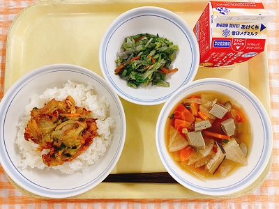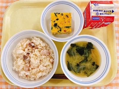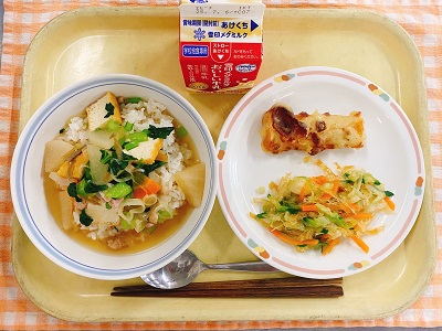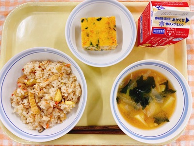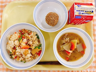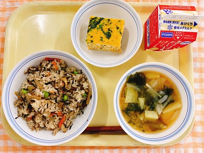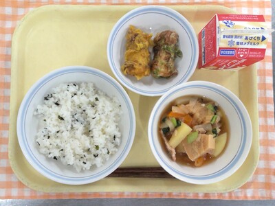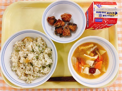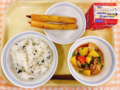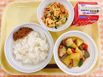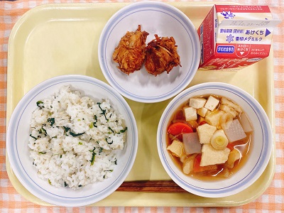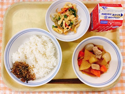 牛乳 わかめご飯 ちくわの二色揚げ 肉じゃが