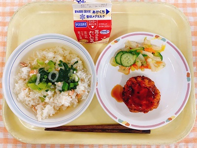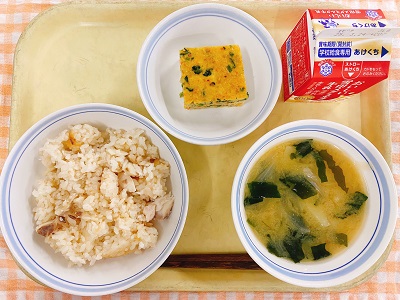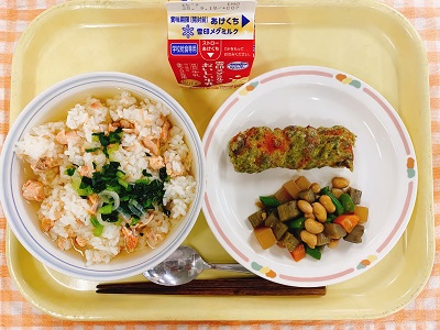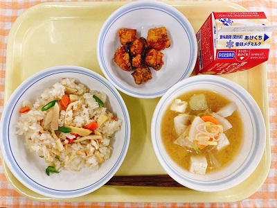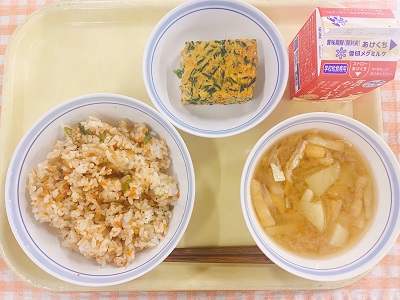 牛乳 たけのこご飯 鮭の香味焼き みそけんちん汁