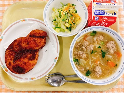 牛乳 黒砂糖パン チキンのサルサソース れんこんチップスサラダ 白菜と鶏肉のスープ