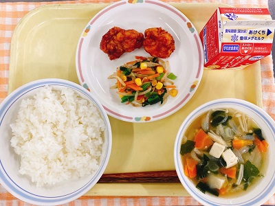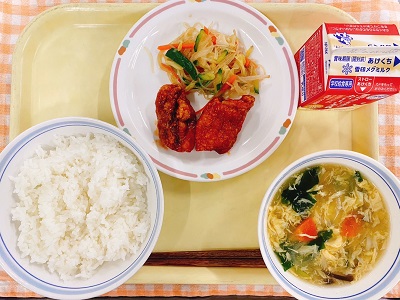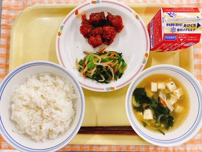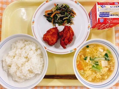 牛乳 ご飯 ヤンニョムチキン ひじきのナムル 卵と豆腐のスープ