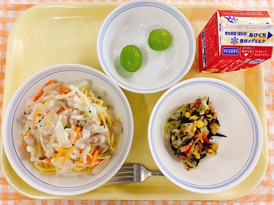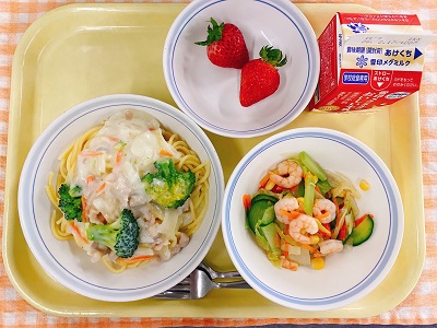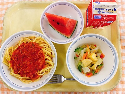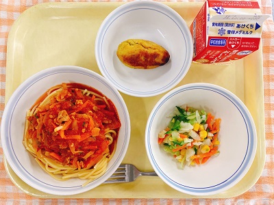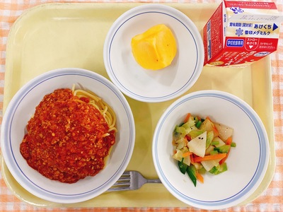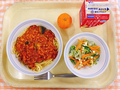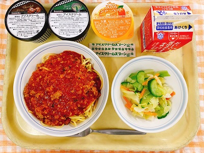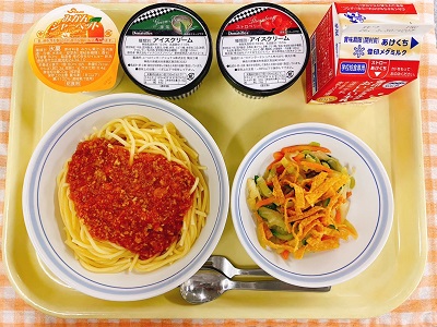 牛乳 スパゲティミートソース フレンチサラダ セレクトアイス(チョコレートアイス・抹茶アイス・みかんシャーベット)