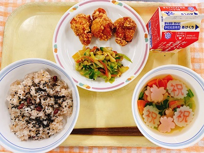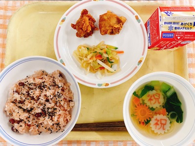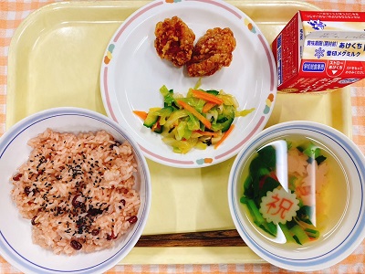 牛乳 赤飯 鶏のから揚げ 昆布サラダ お祝いすまし汁