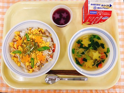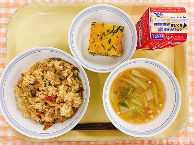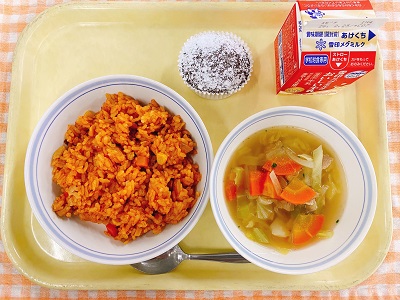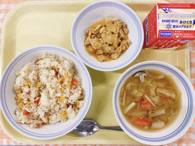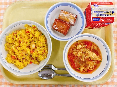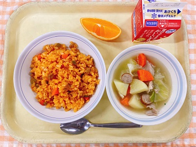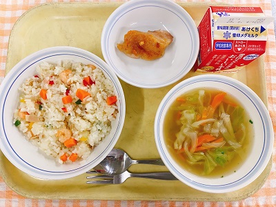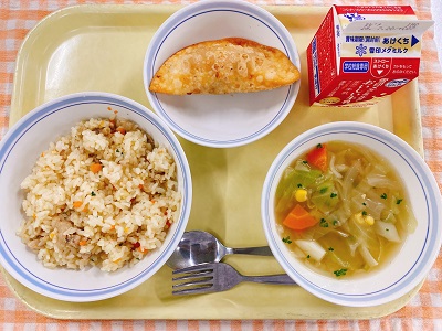 牛乳 えびピラフ マーマレードチキン ジュリエンヌスープ