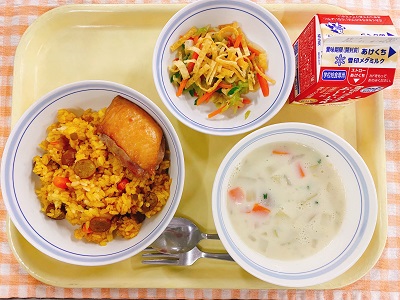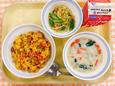 牛乳 カレーピラフ アスパラベーコンサラダ 豆乳チャウダー