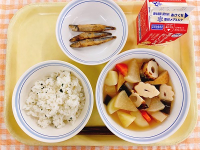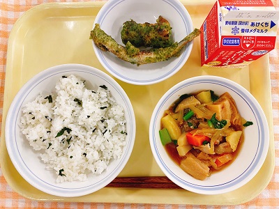 牛乳 わかめご飯 ちくわとししゃもの磯辺揚げ 肉じゃが