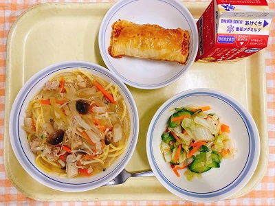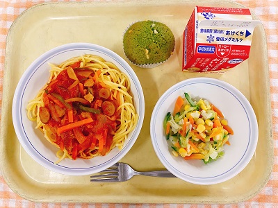 牛乳 スパゲティナポリタンソース コールスローサラダ 抹茶のホワイトチョコチップケーキ