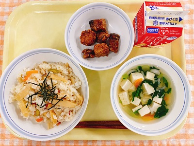 牛乳 たけのこ寿司 かつおの揚げ煮 豆腐のすまし汁