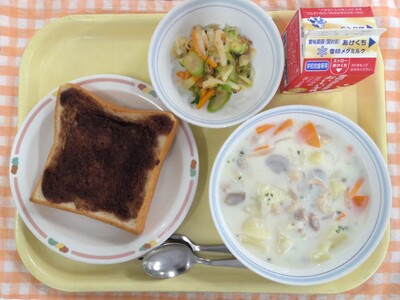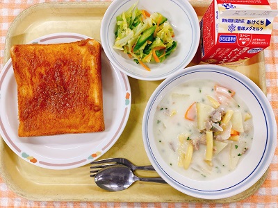牛乳 ココアトースト アスパラのツナサラダ 米粉のクリームシチュー