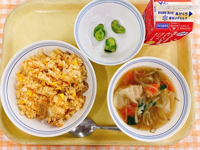 牛乳 豚キムチチャーハン 揚げそら豆 ワンタンスープ