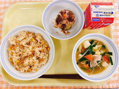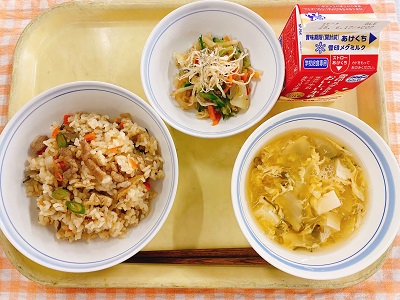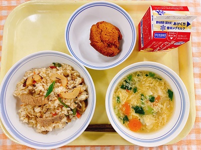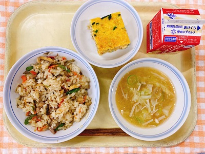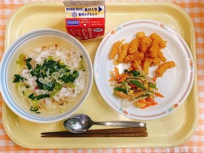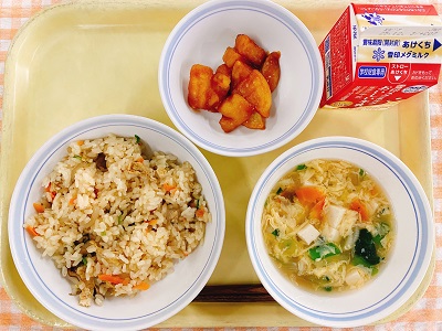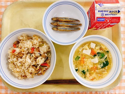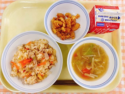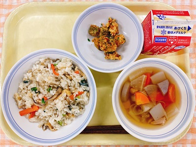 牛乳 五目ご飯 きびなごのから揚げ かきたま汁