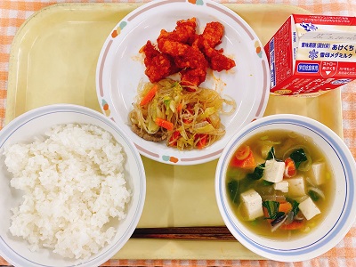 牛乳 ご飯 ヤンニョムチキン 春雨サラダ 卵とわかめのスープ