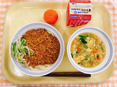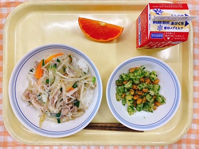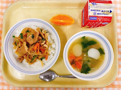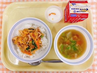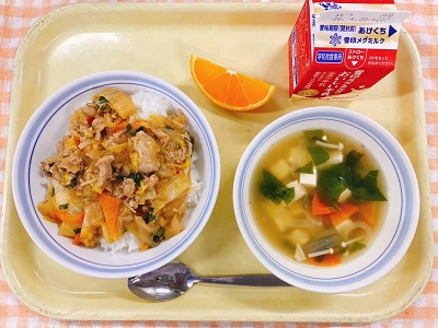 牛乳 豚キムチ丼 豆腐とわかめのスープ 清見オレンジ