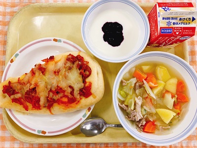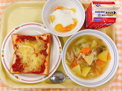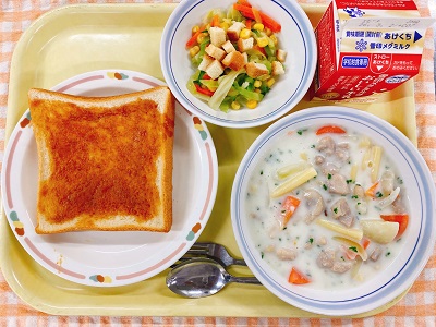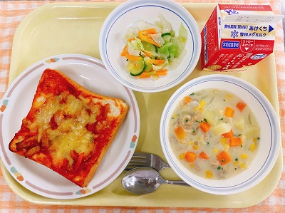 牛乳 ピザトースト フレンチサラダ コーンチャウダー