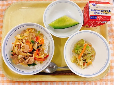 牛乳 うま煮丼 ごまみそ春雨サラダ メロン