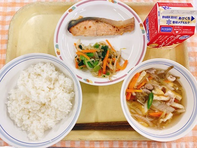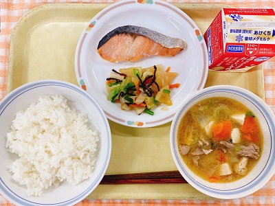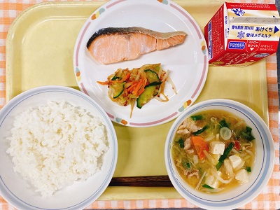 牛乳 ご飯 焼き魚(甘塩鮭) 梅おかか和え スタミナみそ汁