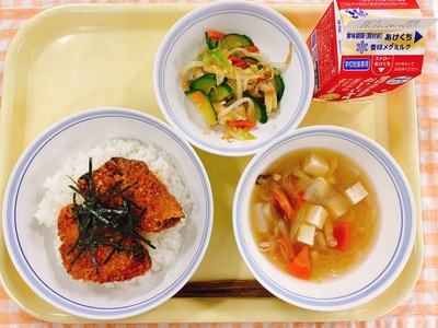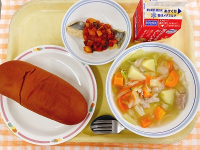 牛乳 ご飯 鯖の味噌煮風 野菜の酢醤油がけ けんちん汁